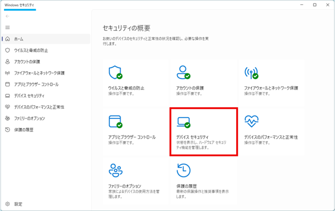「Windowsセキュリティ」が起動したら「デバイスセキュリティ」をクリックします。