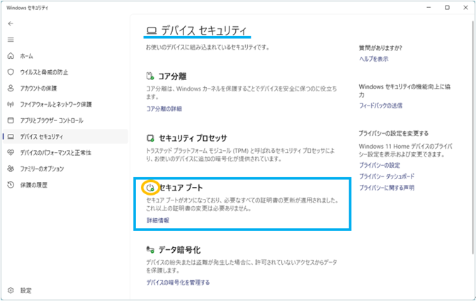 つぎに、セキュアブート証明書の更新状態を「Windowsセキュリティ」で確認します。