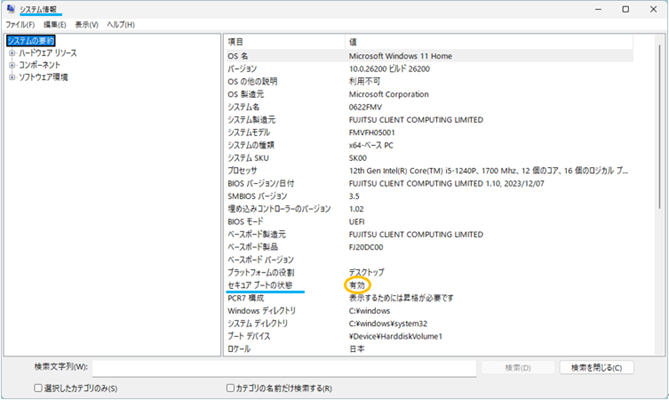 「セキュアブートの状態」が「有効」となっています。