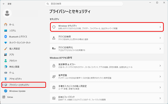 「設定」画面から、「プライバシーとセキュリティ」の「Windowsセキュリティ」をクリックします。
