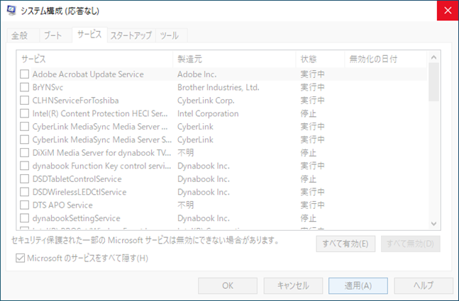 「システム構成」を開き「サービス」タブの「Microsoftのサービスをすべて隠す」にチェックを入れ「すべて無効」をクリックしました。