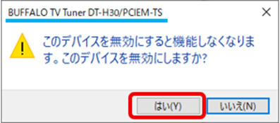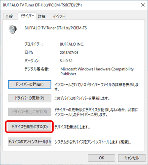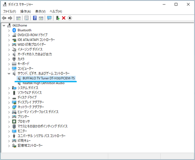 デバイスマネージャーを開き、「BUFFALO TV Tuner DT-H30/PCIEM-TSのプロパティ」を開きます。