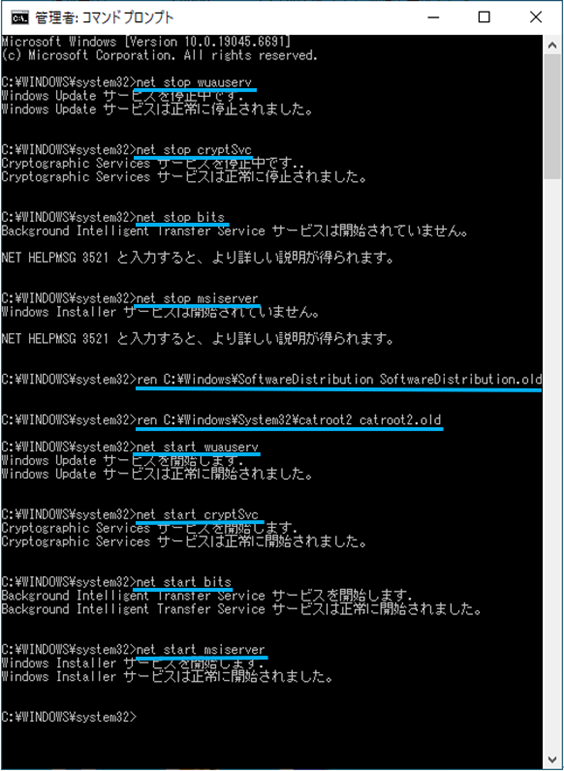これら一連のコマンドは、Windows Updateのプログラムの再起動、Windows Updateのプログラムが格納されているフォルダ名を別の名前に退避させる意味です。