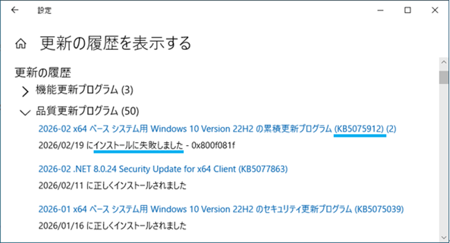 その後も、Windows Updateは全て失敗、エラーコードは全て「0x800f081f」です。