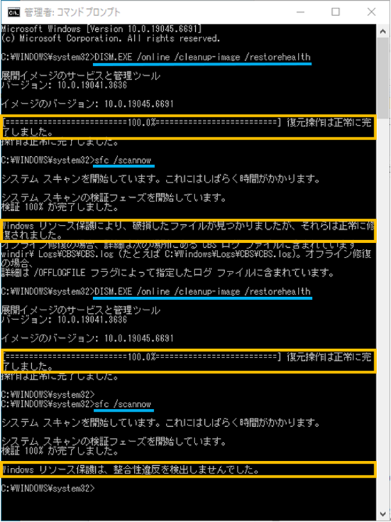 DISMとSFCは1回の実行で問題の修復が終わらないそうです。