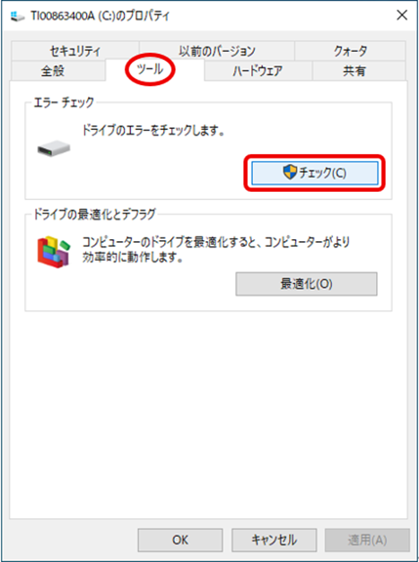 「(C)ドライブのプロパティ」の「ツール」タブを開きます。